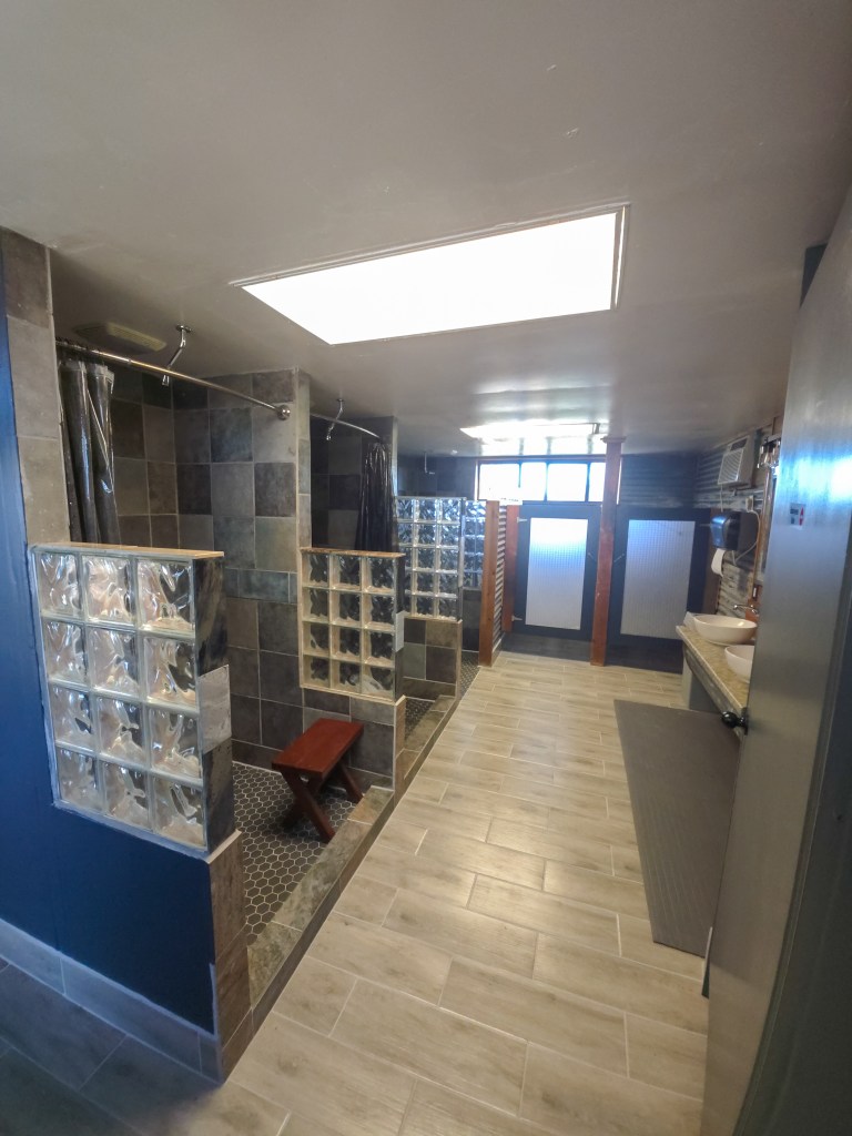 The Circle J boasts one of the cleanest and most well-appointed shower house you’ll find in any campground. This converted tractor barn has two individual toilet stalls, two recently expanded individual showers stalls, and the shower suite (a 5 ‘X 5′ changing area coupled with a 5′ X 5’ wet room, shower & toilet). Plenty of hot and cold running water, and a spacious vanity area with three vessel sinks so no waiting. Only need a quick rinse off after a dip in the pond or pool. Try our fun garden shower, an open-air shower enclosure, featuring three shower heads, permanent concrete floor, and corrugated privacy walls.